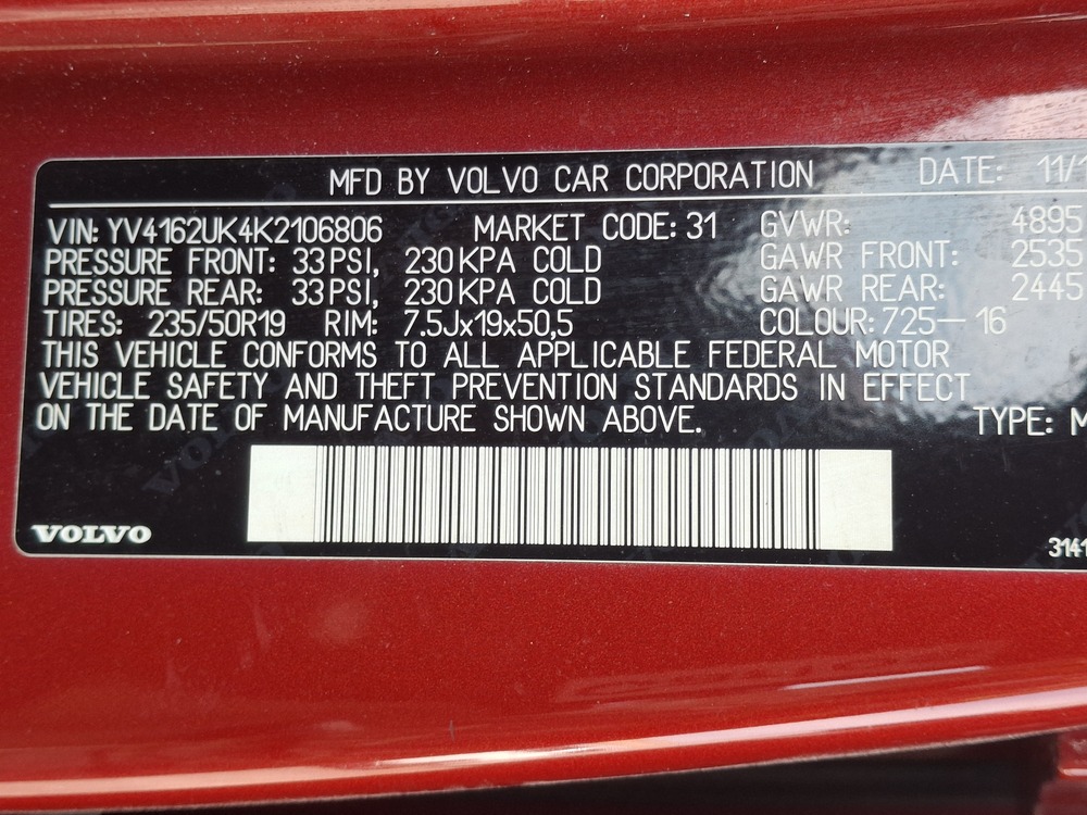 VIN number YV4162UK4K2106806