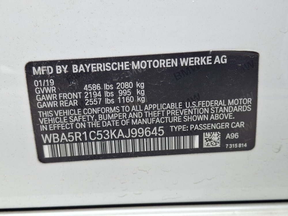 VIN number WBA5R1C53KAJ99645