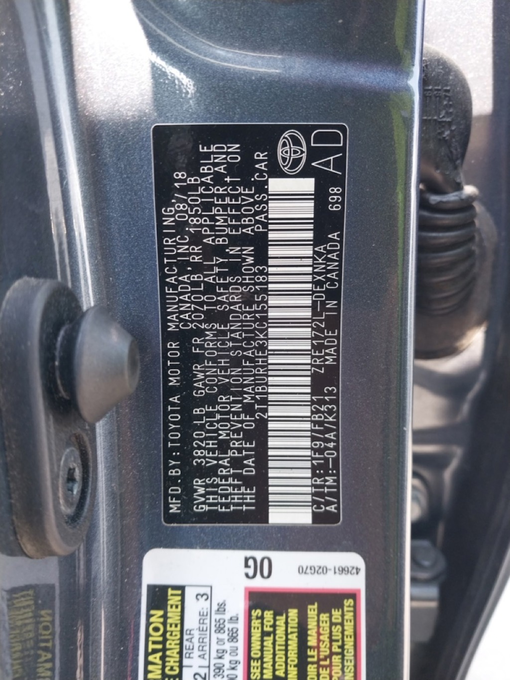 VIN number 2T1BURHE3KC155183
